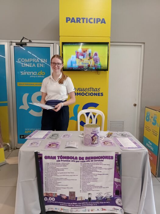 In meiner bisherigen Zeit hier durfte ich schon viel lernen. Natürlich vor allem viel im Taller, was eher Handwerkliches angeht, aber gerade auch in den letzten Wochen, wo sich mein Aufgabenbereich etwas verändert hat: Der Verkauf von Losen für die Tombola de bendiciones, zu Deutsch Segenstombola, hat begonnen. Diese ist, gemeinsam mit Mozos Famosos (wovon ich ja bereits berichtet hatte), eine riesige Veranstaltung, um Spenden für die Schule zu sammeln. Jede*r Mitarbeiter*in bekommt eine (je nach Arbeitsbereich unterschiedliche) Anzahl an Talonarios (Losblöcke), die er oder sie verkaufen soll. Jeder Block beinhaltet 50 Lose à 200 DOP, umgerechnet ungefähr 3 €, und dann heißt es: Käufer finden. Dafür fragen die meisten meiner Kolleg*innen vor allem im Familien- und Freundeskreis nach, um ihre Losblöcke zu verkaufen. Allerdings, und darin besteht auch meine neue Aufgabe, gibt es auch noch sogenannte Operativos, also quasi Einsätze außerhalb der Schule. Dafür stellen sich die Mitarbeiter aus dem Verwaltungs- und Fundraisingbereich (und ich) fast jedes Wochenende von Anfang März bis Ende Mai in Malls und Supermärkte, die Sponsoren der Tombola sind (und teilweise auch zu den Preisen beisteuern), um dort den Einkaufenden die Fundación vorzustellen und sie um eine Spende, meistens in Form vom Kaufen eines Loses, zu bitten. Damit bin ich aktuell viele Wochenenden verplant.
