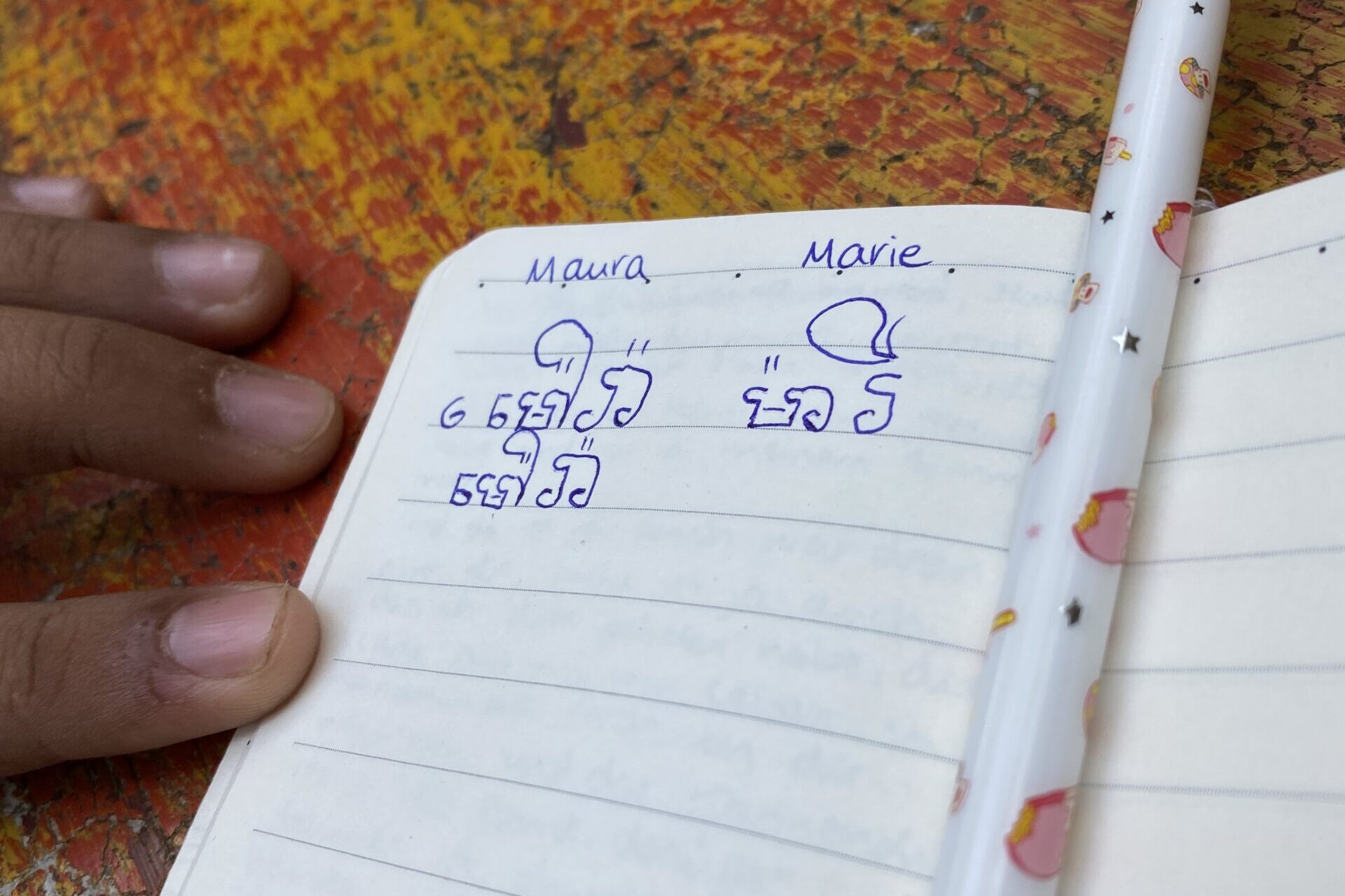 An einem anderen Nachmittag hat mir eine ganze Traube von Kindern beigebracht meinen Namen auf Khmer zu schreiben. Es hat mich etwas Zeit und Übung gekostet, aber bei so vielen tollen Lehrern habe ich es mittlerweile richtig gut drauf. Mal ganz abgesehen davon, dass mein Name auf Khmer wunderschön und ziemlich cool aussieht, fällt es den Kleinen nun auch viel leichter meinen Namen auszusprechen, da sie ihn nicht nur hören sondern auch lesen können.
