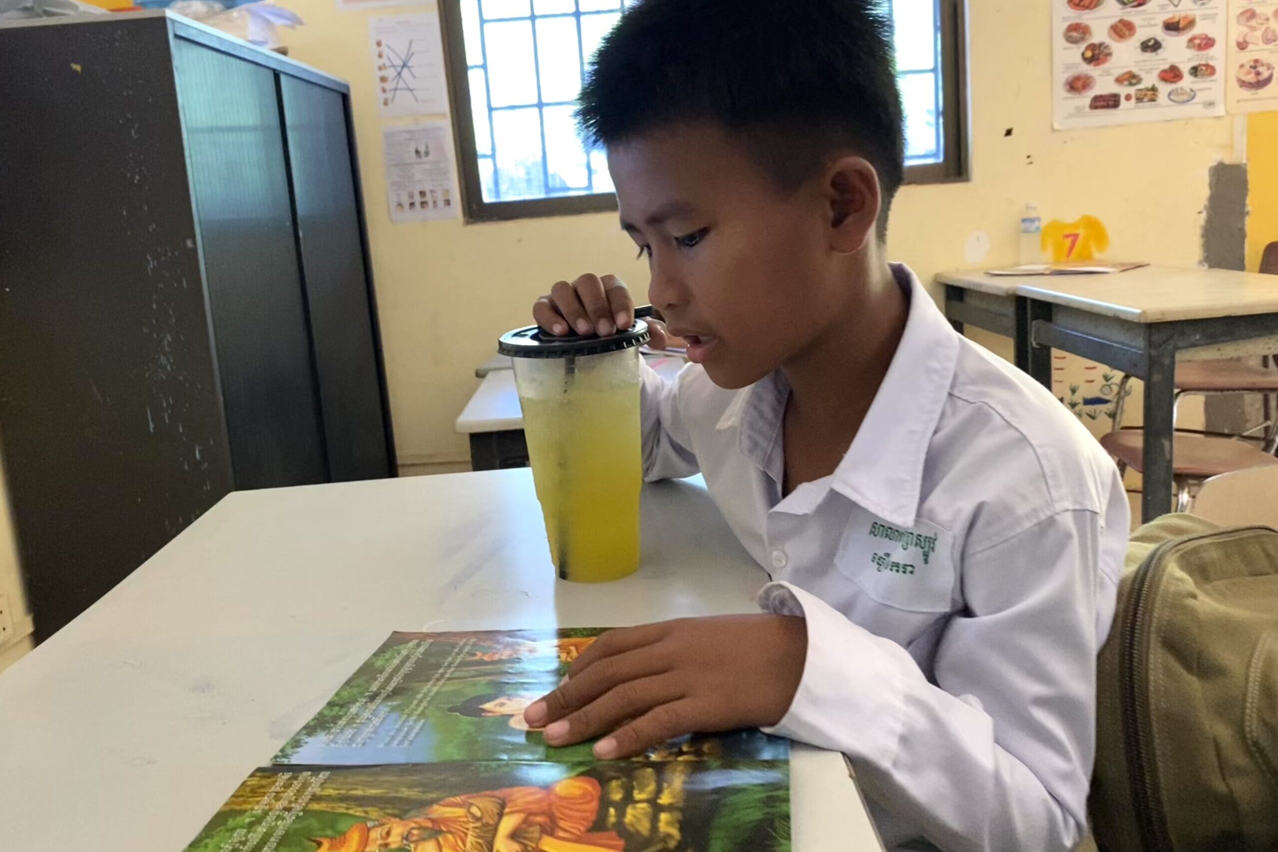 Nach dem Mittagessen geht es für die Grundschüler meistens in die kleine Bibliothek, „banalei“ genannt, wo sie fleißig Khmer lesen üben. Mit über 70 Buchstaben ist das nämlich gar nicht so einfach und die Kinder fangen deshalb auch erst etwas später als in Deutschland mit dem Lesen an. Der kleine Makara hat für sich eine tolle Lösung gefunden, diese Zeit zu verbringen. Einige der Bücher erzählen die Geschichten sowohl auf Khmer als auch auf Englisch. Jeden Nachmittag besteht er jetzt darauf, mir etwas aus diesen Büchern vorzulesen und ich lese im Gegenzug den englischen Teil vor. Zusammen lernen wir so eine ganz Menge neuer Wörter – er auf Englisch, ich auf Khmer. Er ist ein wunderbarer kleiner Lehrer : )