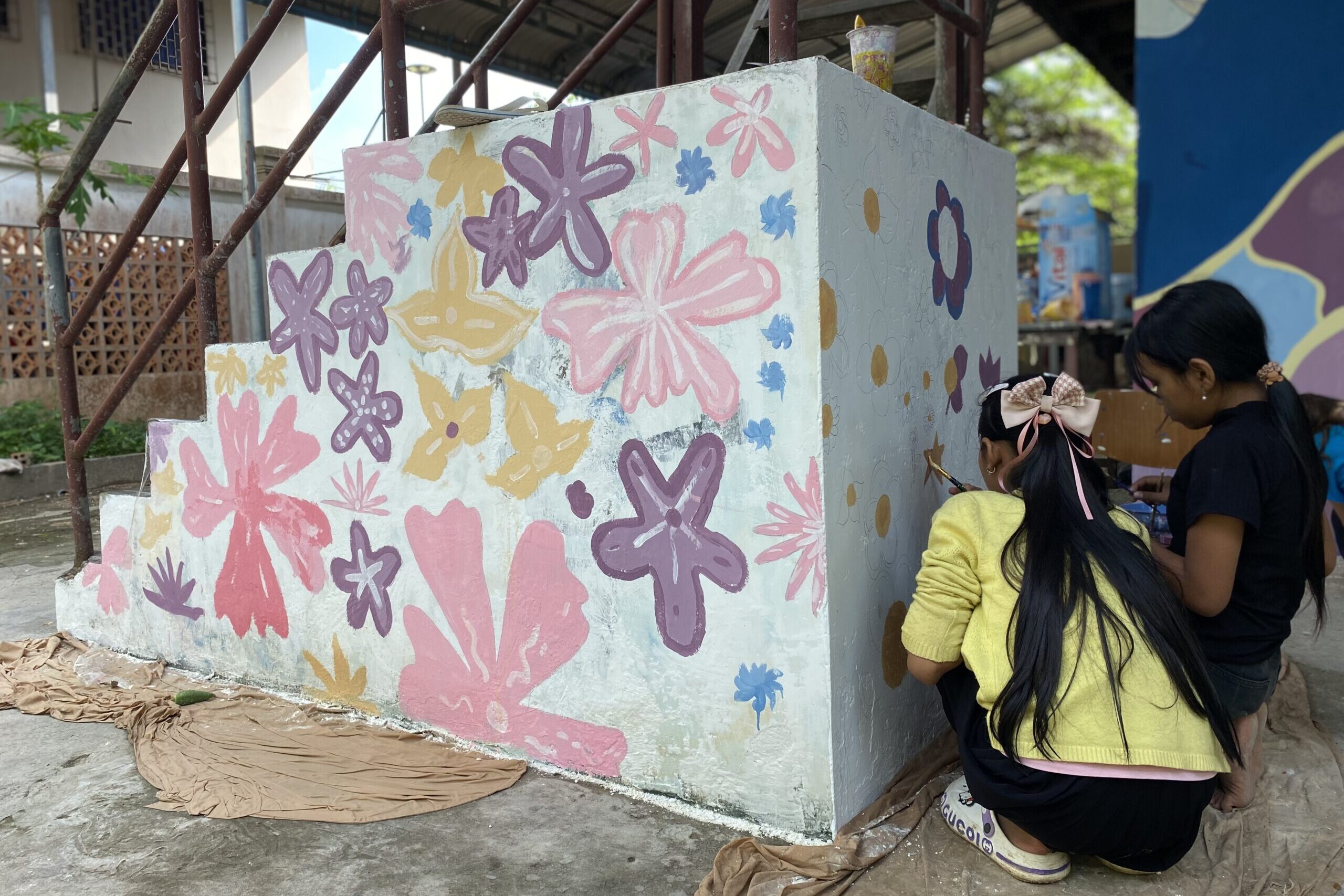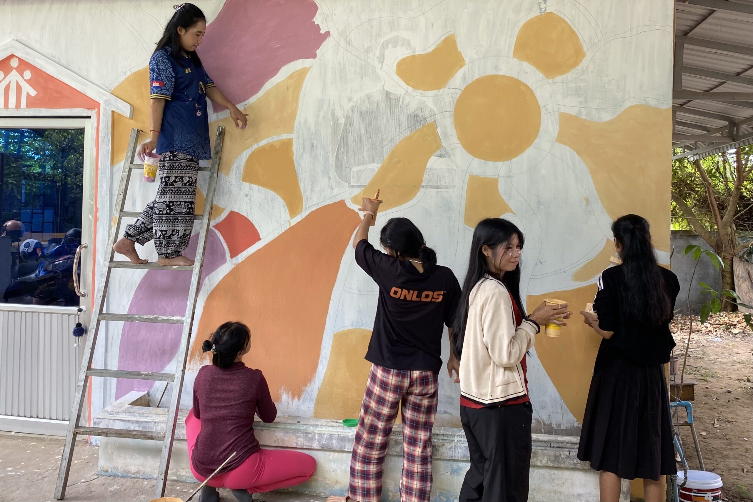 Anfangen möchte ich natürlich mit dem Endergebnis unsere Malaktion, das ich euch im letzten Blog versprochen habe. Auch wenn nicht alles glatt lief – wir die eigentlich geplanten Farbtöne nicht auftreiben konnten, die kleinen Mädels auch mal über den Rand gemalt haben und auch der ein oder andere Frosch sich verewigen wollte – nach einer guten Woche und täglichen Malsessions haben wir es dann aber geschafft und ich finde, die fertige Wand kann sich wirklich sehen lassen. Der Eingang zu dem zu Hause der Mädchen, der den schönen Namen „Palast der Frauen – Bantey Srey“ trägt, sieht nun richtig freundlich aus und wir alle hatten eine Menge Spaß.